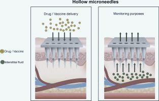A variety of micron-sized hypodermic needles known as hollow micro needles (HM) are used to administer a variety of medicinal substances [53]. For instance, Pre-loaded insulin in such HM might offer a rapid and simple way to administer insulin for type 1 diabetes in place of a traditional hypodermic needle, which could cause unanticipated trypanophobia or dangerous infections during injection. Davis et al. showed that hollow metal micro needles might provide an insulin dosage for diabetes that is physiologically appropriate [54]. In this investigation, 50 mU of insulin given via a traditional hypothermic needle had the same pharmacokinetics as a single nickel-coated titanium-copper-titanium metal HM with a sharp, hollowed, and funnel-like form in hairless diabetic rats. Furthermore, certain improved geometric properties of HMs have been investigated [55, 56]. Out-of-plane figures, in which the needles are arranged perpendicularly in a two-dimensional array, have been proposed as an alternative to in-plane HMs. HMs can reduce the risk of clogging when administered through the skin while providing the necessary drug exposure through the needles and barrel sidewalls due to their two potential opening sites at the Out-of-plan. Anisotropic wet etching, deep-reactive ion etching, and conformal thin film deposition were among the production techniques utilised in investigation to show an out-of-plane HM with varying tip curvatures. Similarly, continuous isotropic and anisotropic etching was used to create silicone HM coated in titanium and gold with tapered points [57].According to this study, the silicone base had an outer diameter of 160 µm, and the tapered tips in the silicone HM array were made with 130 µm thanks to the isotropic etch. The silicone HMs were then made implantable by applying titanium and gold coatings. Due to their coating of these metals, the silicone HM was approximately ten times more resistant to breaking under pressure than the skin. However, older HM designs require costly and sophisticated instruments in several production processes. The more useful option for producing hollow needles with comparatively easy solvent casting techniques is to use polymeric HMs. When the polymer dried, Mansour et al. produced strong polymeric micro needles using a spin-coated clay-reinforced polyimide on an SU-8 pillar mould constructed on a 300 µm thick Pyrex glass substrate [56]. Next, the writers created apertures at the tip using sanding or plasma etching procedures. Despite the simplicity of this polymer-based approach, the polymeric HMs demonstrated enough mechanical strength to be inserted through the skin. There are two distinct HMs in the market. Drugs are administered by a hollow array of stainless steel micro needles in the AdminPen® syringe (Nano biosciences, LLC., Sunnyvale, CA, USA) [58]. Depending on the company's requirements, the MN might range in length from 600 to 1500 µm.As a result, applying it could be little painful. Regardless of the respondents' level of pain, a study examining the association between normalised pain levels and the lengths of micro needles (480, 700, 960, and 1450 µm) revealed that greater MN lengths progressively increased pain scores [59]. The authors found that when the 26-gage hypodermic needle's discomfort was given a 100% score, a threefold increase in MN lengths causes the pain scores to increase sevenfold, from 5% to 37%. A glass cartridge and uniformly spaced micro needles make up the HM array of the 3M Hollow Microstructure Transdermal System (hMTS), another commercial HM [60].