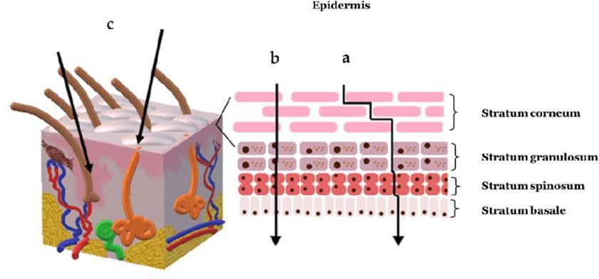 Fig. 3: Penetration routes: a) Intercellular, b) transcellular and c) transappendageal pathways