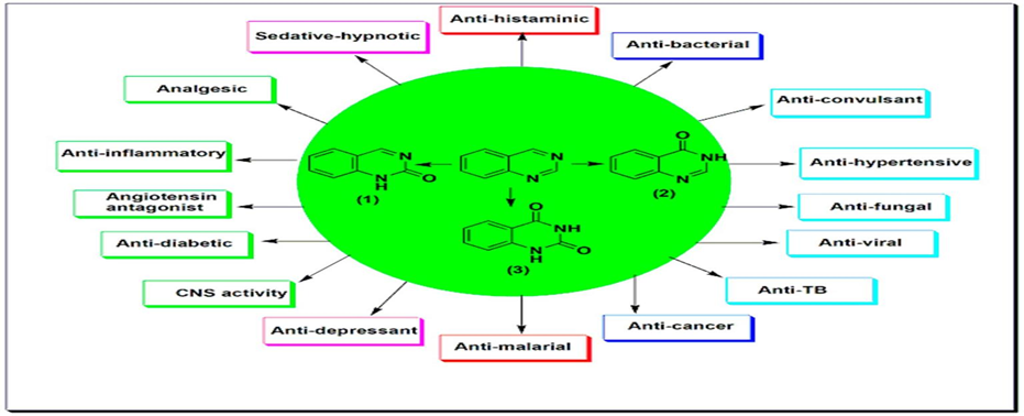 Quinazolines have a wide range of pharmacological activities41-43. They are used as anticancer, antiviral, antibacterial, antitubercular, analgesic, antihypertensive, anti-inflammatory, antidiabetic, sedative-hypnotic, antihistaminic, anticonvulsant, and many other uses42-46.