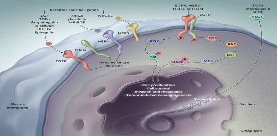 Epidermal growth factor receptor (EGFR) is a vital intermediate in cell signaling pathway including cell proliferation, angiogenesis, apoptosis, and metastatic spread and also having four divergent members with similar structural features, such as EGFR (HER1/ErbB1), ErbB2 (HER2/neu), ErbB3 (HER3), and ErbB4 (HER4). EGFR is a transmembrane receptor belonging to a family of four related proteins (Fig. 1).2 Ten different ligands can selectively bind to each receptor. After a ligand binds to a single-chain EGFR, the receptor forms a dimer3 that signals within the cell by activating receptor autophosphorylation through tyrosine kinase activity.3 Autophosphorylation triggers a series of intracellular pathways that may result in cancer-cell proliferation, blocking apoptosis, activating invasion and metastasis, and stimulating tumor-induced neovascularization. Despite this, clinically exploited inhibitors of EGFR (including erlotinib, lapatinib, gefitinib, selumetinib, etc.) are not specific thus provoking unenviable adverse effects. Some of the paramount obstacles to generate and develop new lead molecules of EGF drug resistance, mutation, and also selectivity which inspire medicinal chemists to generate novel chemotypes. The discovery of therapeutic agents that inhibit the precise stage in tumorous cells such as EGFR is one of the chief successfultargets in many cancer therapies, including lung and breast cancers31. The over expression of EGFR has been recognized as the driver mechanism in the occurrence and progression of carcinomas such as lung cancer, breast cancer, pancreatic cancer, etcetera. EGFR receptor was thus established as an important target for the management of solid tumor32.One major family of sensors is comprised of trans membrane receptors with intrinsic protein tyrosine kinase activity (RPTK), the prototypal member of which is the EGF receptor (EGFR; also referred to as HER (human EGF receptor) and c-erbB1) as it was the first receptor described to possess tyrosine kinase activity and the first member of this superfamily to be sequenced33.