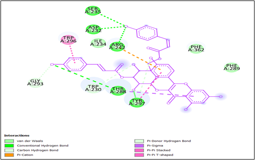 Whereas Figure 21 shows last interaction between 3-cinnamoyltribuloside and it includes Van der Waals interactions with SER A:235, ASP A: 232, ILE A:234, GLY A: 293, and two residues of PHE A: 362 and PHE A: 289. Conventional hydrogen bonds are observed with TRP A: 230 and THR A: 288. There is a carbon hydrogen bond with TRP A:296. A pi-cation interaction is present with ARG A:242, providing an important electrostatic interaction. Pi-sigma interactions occur with TYR A:297, enhancing the binding through aromatic stacking. Additionally, pi-pi stacking interactions are observed with PHE A:289 and PHE A:362, which further stabilize the ligand through aromatic ring interactions. Lastly, a pi-pi T-shaped interaction is seen with TRP A:230, which contributes to the overall stability and binding affinity of the ligand.