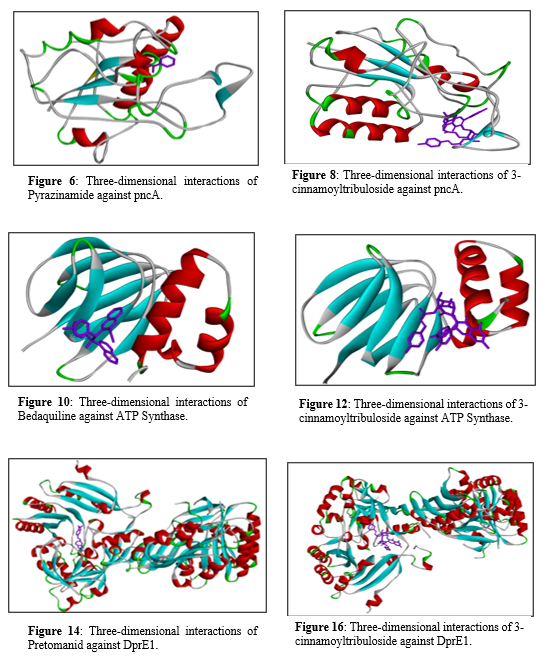 Interaction Analysis: The Figure 1 represents the 3D diagram of reference drugs Isoniazid, Pyrazinamide, Bedaquiline, Pretomanid and Delamanid with their respective target proteins InhA, pncA, ATP Synthase, DprE1 and DprE1 also the control drug, 3-cinnamoyltribuloside.