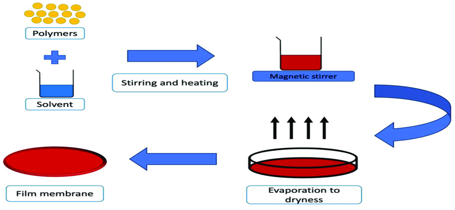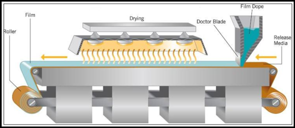 Solvent Casting Method: One of the earliest and most straightforward processes for making films is solvent casting, which was first created for the photography industry more than a century ago. In the 1950s, thermoplastic polymer film extrusion took over as the primary production method, but solvent casting is regaining popularity as a means of creating high-quality films.Using this procedure, a viscous solution is first created by mixing water-soluble components. A lesser volume of solution is used to dissolve the API and the other components. A high shear process is used to mix the two solutions. The trapped air is removed using a vacuum. After the solution has formed, it is poured into a glass mold and let to dry in an oven set at 45 to 50 degrees Celsius. Next, cut into the appropriate-sized and shaped pieces. [1]