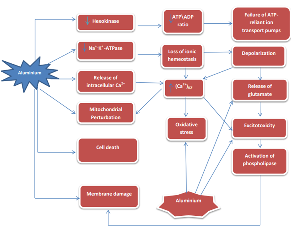 Aluminium is reported and details to influence a number of reactions in the central nervous system which is vital and it sequels various adverse side effects. Major and salient retort for growth of brain such as formation of neurotransmitter synthesis, axonal transport, inflammatory responses, transmission of synapsis and protein phosphorylation, protein Deterioration, inflammatory retort and gene expression. Al3+ getting on for negatively charged, ligands of oxygen donor where it has a greater affinity. Other class like organic and inorganic phosphates, deprotonated hydroxyl groups and carboxylate groups forms a powerful bond with Al3+. These feasible aluminium (Al3+) characteristic undergo secure, powerful affix with phosphate group of RNA and DNA, where topology of DNA is affecting and impacting the expression of gene essential for brain functioning. Moreover, Aluminium has powerful positive charge and small ionic radius in contrast to Ca2+, Zn2+, and Na+. Therefore, aluminium powerfully affix and attach to metal-binding amino acids like (tyrosine, arginine, histidine etc.). Ultimately, protein oligomerization induces and give raise to some important configurational difference that can restrict their deterioration and breakdown by proteases (Kawahara et al., 2011). Eventually aluminium undergoes damage and results death of neuronal cells and glial cells which is apoptosis. Moreover, it weakens the enzyme that intricate in the genesis of neurotransmitter and govern content of neurotransmitter. Aluminium also restricts receptors of neurotransmitter and Ca2+ channels which is voltage gated and further impedes synaptic transmission and ultimately leads to neurotoxicity, and weakens functions of the brain related learning and memory (Kawahara et al., 2011).