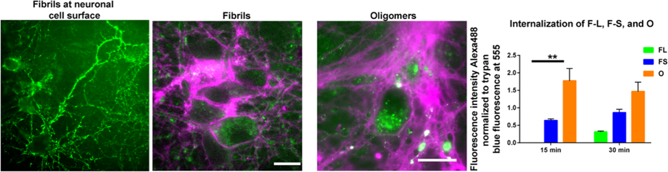 Α-Synuclein fibrils spread by attaching to neuronal surfaces and entering the cytoplasm. This process may require specialized receptors or protein changes. Researchers used Alexa-488 labelling to visualize fibril adhesion and internalization in primary hippocampus neurons. Trypan blue treatment identified intracellular fibrils short fibrils, anc Quantification revealed variable and oligomers, offering insight into the species most associated with Parkinson's pathology.