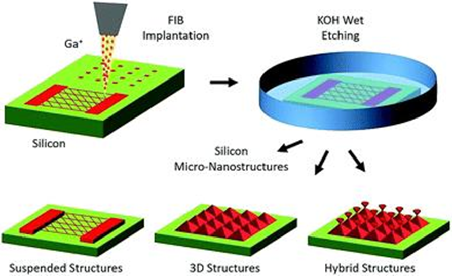 Schematic diagram of the fabrication of 3D micro-nanostructures with an ion beam through bulk Si structuring. This involves implantation in Si through Ga FIlithography and mask-writing at nanometer resolution, subsequent anisotropic wet etching in KOH solution, and the fabrication of Si micro-nanostructures via the selective removal of the unplanted region. Reprinted with permission from ref. 37. Copyright: ©2020, Elsevier B.V. All rights reserved