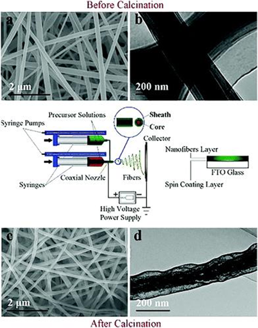 Electrospinning is one of the simplest top-down methods for the development of nanostructured materials. It is generally used to produce nanofibers from a wide variety of materials, typically polymers.28 One of the important breakthroughs in electrospinning was coaxial electrospinning. In coaxial electrospinning, the spinneret comprises two coaxial capillaries. In these capillaries, two viscous liquids, or a viscous liquid as the shell and a non-viscous liquid as the core, can be used to form core–shell nanoarchitectures in an electric field. Coaxial electrospinning is an effective and simple top-down approach for achieving core–shell ultrathin fibres on a large scale. The lengths of these ultrathin nanomaterials can be extended to several centimetres. This method has been used for the development of core–shell and hollow polymer, inorganic, organic, and hybrid materials.29 A schematic diagram of the coaxial electrospinning approach can be seen in Schematic diagram of the coaxial electrospinning technique (center), and FESEM (a and c) and TEM (b and d) images of fibres before and after calcination. Reprinted with permission from ref. 30. Copyright: ©2012, Elsevier Ltd. All rights reserved.