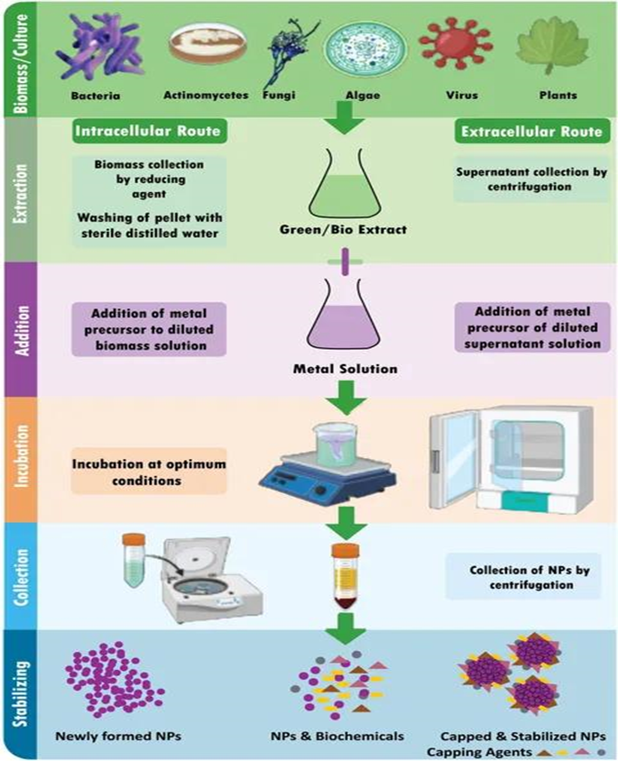 Microbes use metal capture, enzymatic reduction, and capping to create nanoparticles. Before being converted to nanoparticles by enzymes, metal ions are initially trapped on the surface or interior of microbial cells (Ghosh et al., 2021). Use of microorganisms (especially marine microbes) for synthesis of metallic NPs is environmental friendly, fast and economical (Patil and Kim, 2018). Several microorganisms are used in the synthesis of metal NPs, including: