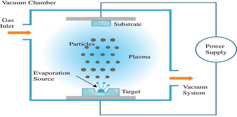 Physical vapor deposition (PVD) is a process applied to the synthesis of ultra-thin films and surface coatings. It is used to produce metal vapor that can be deposited on the conductive layer as ultra-thin films and alloy coatings. The whole process is carried in a vacuum held in a vacuum chamber about 10−6 torr from a cathodic-arc source. In a clean atmosphere, vacuum deposition is held in the chamber and the metals are deposited as wider or sputtered in the localized area. Reactive PVD is designed in a method to deposit metal on the surface and reactive gas such as oxygen, nitrogen, or methane passed in the vacuum chamber. Plasma, the high energetic beam bombards the metal surfaces ensuring hard and dense coating. Using this method, we can synthesis nano-particles and allow to fabricate nanocomposites. Thin film formation is characterized by the metal ions in the vapor phase obtained from condense phase and return back to condense phase of thin films [30]. The PVD includes evaporation and a sputtering process to fabricate thin films. The procedure for PVD includes sputtering process that is carryover in the vapor phase under supersaturation. In an inert atmosphere the metal vapors are promoted to condense phase, and it is subjected to thermal treatment to get nanocomposites. The advantage of the PVD techniques include (i) having improved properties as compared with the substrate material; (ii) inorganic and few organic materials are used, and it is an ecofriendly approach as compared to electroplating technique. This technique also faces few difficulties such as (i) coating with complex structures; (ii) it is not cost-effective and produces a low output; and (iii) it is a complex process.