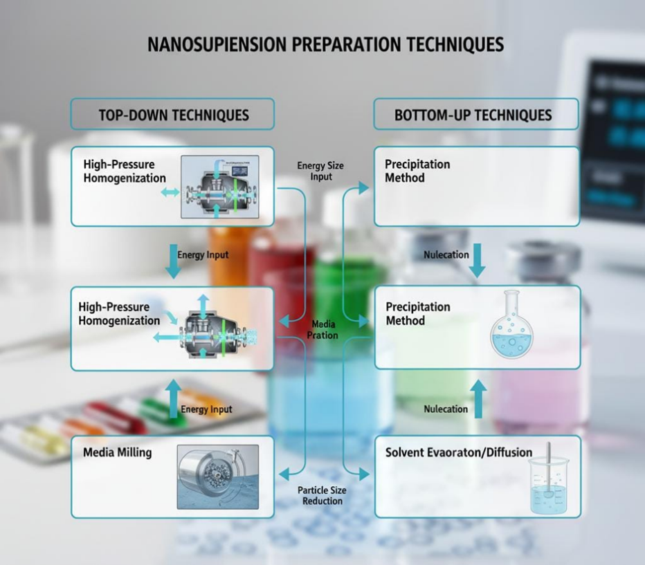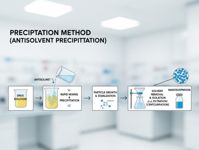 These techniques involve dissolving the drug and then precipitating it out in the presence of stabilizers to control crystal growth, resulting in nanosized particles.