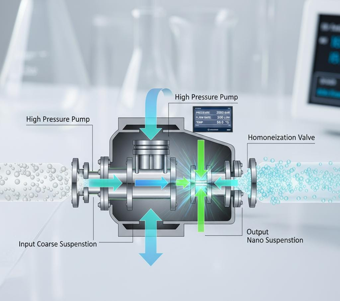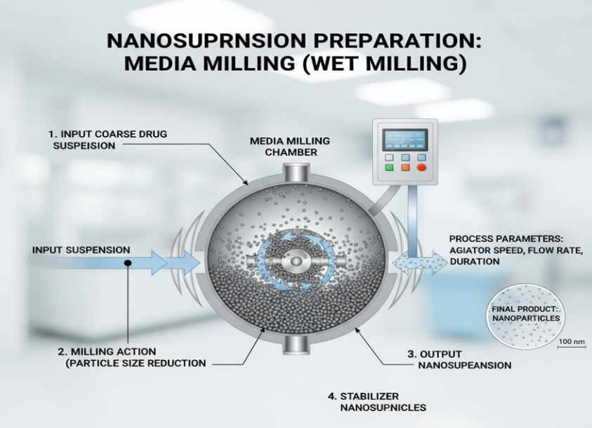 Process: The drug powder is first dispersed in an aqueous solution containing stabilizers (surfactants and/or polymers) to form a pre-suspension.