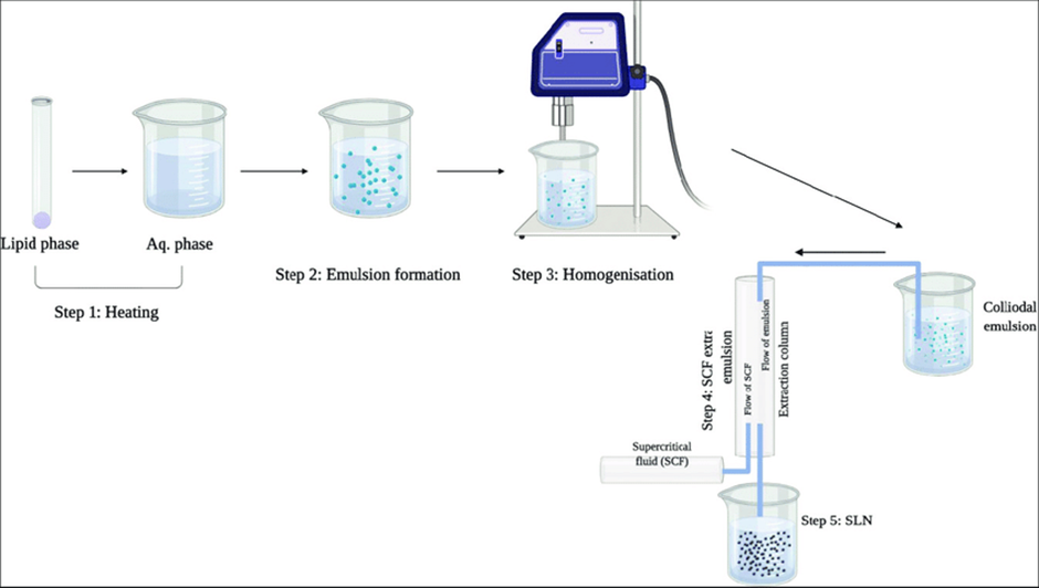 SAS (Supercritical Antisolvent): scCO_2 is used as an anti-solvent. A solution of the drug in an organic solvent is sprayed into scCO_2. The scCO_2 rapidly extracts the organic solvent, causing the drug to precipitate as nanoparticles.