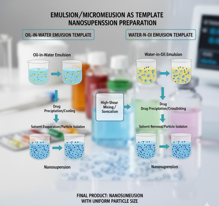 For microemulsion templates, a thermodynamically stable, transparent microemulsion is formed first. The drug precipitates upon dilution with the non-solvent.