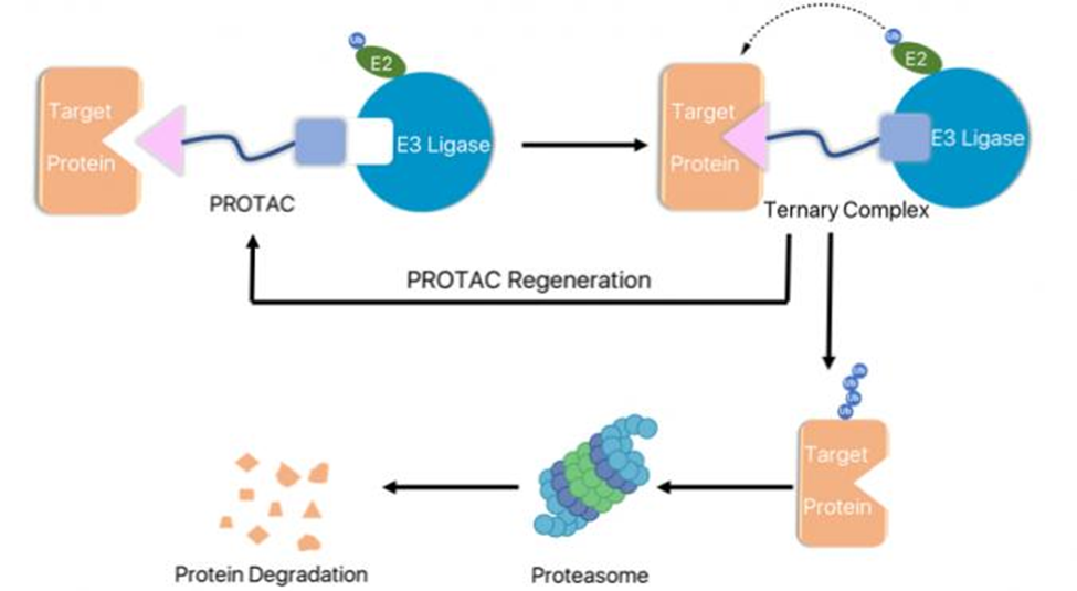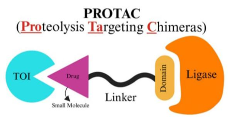 PROTACs (Proteolysis Targeting Chimeras) are a new and innovative technology for cancer treatment. Unlike traditional drugs that only block protein activity, PROTACs remove harmful proteins completely. They work by maintaining a balance between protein production and protein degradation. A PROTAC molecule has two active parts connected by a linker—one part binds to the target protein and the other binds to the cell’s protein-degrading system. This leads to the destruction of unwanted proteins, such as kinases, structural proteins, and regulatory proteins.