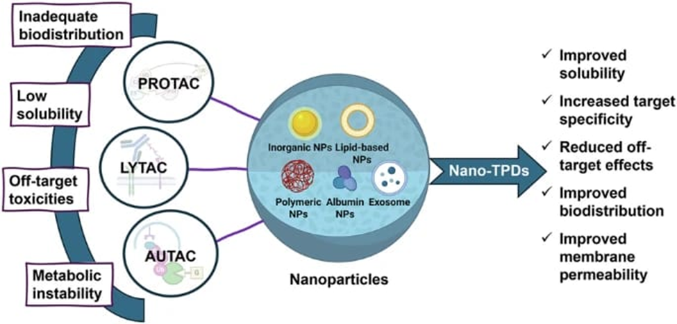 Novel degraders such as LYTACs, AUTACs, ATTECs, and MITACs expand protein degradation beyond the ubiquitin–proteasome system to include lysosomal and autophagy-mediated pathways. Nano-delivery systems further enhance their stability, tissue penetration, and in vivo applicability.