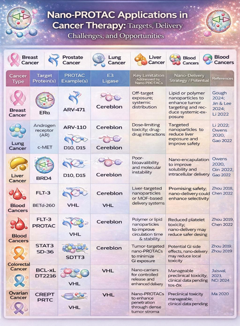 This publication highlights how nano PROTACs are a new and powerful technology for treating many diseases, especially cancer. PROTACs work by removing harmful proteins from cells Instead of just blocking them. This helps stop cancer cells from growing and can also activate the immune system, making treatment more effective.