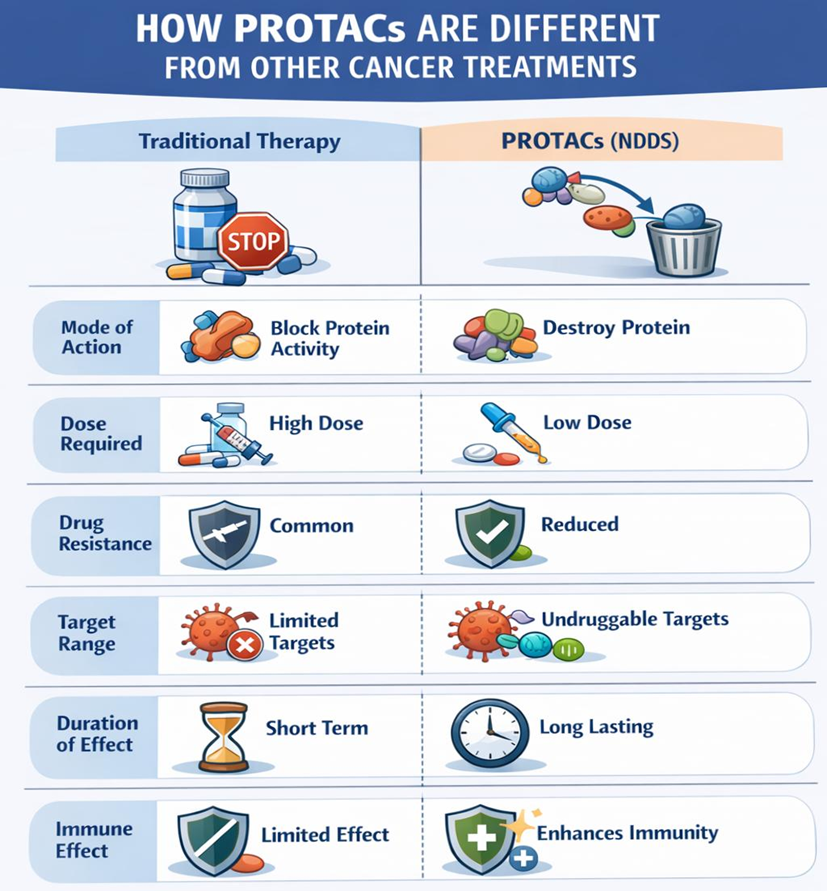 PROTACs are a next-generation cancer treatment because they are more precise, work at lower doses, overcome drug resistance, and can target proteins that other drugs cannot. As NDDS, they represent a smarter and more effective approach than many existing cancer therapies.