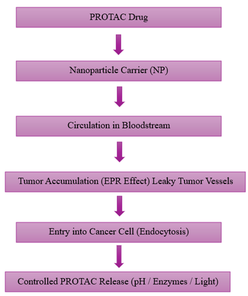 Despite these advantages, PROTACs face challenges such as poor solubility, low stability, and limited ability to enter cells. To overcome these problems, nanodrug delivery systems (NDDS) play a very important role. NDDS help improve PROTAC delivery by increasing solubility, enhancing cell uptake, reducing side effects, and delivering drugs directly to tumours through mechanisms like the enhanced permeability and retention (EPR) effect. Various nanocarriers, such as lipid nanoparticles, polymeric nanoparticles, and inorganic nanoparticles, are used. Review studies report strategies like drug encapsulation, chemical conjugation, and smart stimuli-responsive systems to improve tumour targeting and treatment effectiveness in cancers such as prostate, breast, and gastrointestinal cancers.