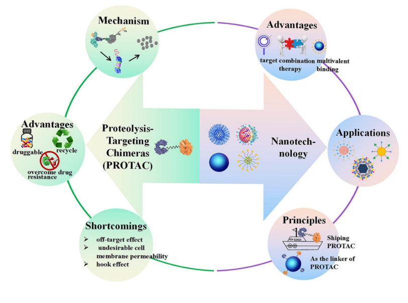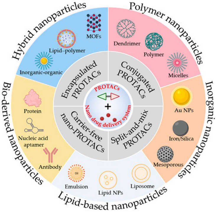 We Building upon the successful clinical and preclinical application of Nano platforms for small-molecule drugs, nucleic acid therapeutics, and protein-based pharmaceuticals, Nano carrier technologies have been progressively integrated into PROTAC delivery strategies. The implementation of these nanoplatforms using smart and functional materials significantly facilitates the clinical translation of nano-PROTACs by addressing critical challenges related to molecular stability, biodistribution, pharmacokinetics, and degradation efficiency.