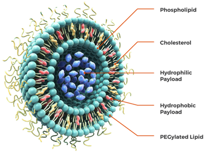 A membranous lipid bilayer, primarily made up of natural or manufactured phospholipids, completely encloses the aqueous volume of liposomes, which are concentric bi-layered vesicles. Lipids, or fat molecules around a water core, are tiny pouches that are frequently employed in therapeutic cancer treatment. Numerous liposome types are used extensively to combat infectious diseases and are capable of delivering specific vaccinations.14 The spherical particles known as liposomes encapsulate the solvents that are freely floating within them.