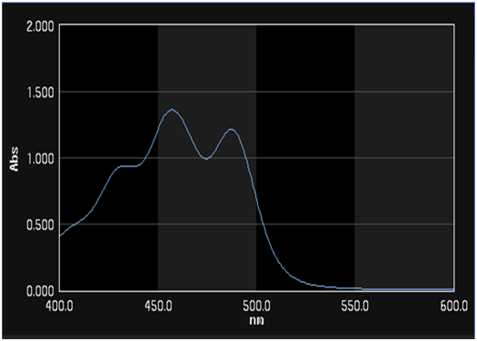 The UV-Visible absorption spectra of the annatto extract in ethyl acetate [figure 6] were recorded to confirm the presence of bixin. The UV-Vis spectrum exhibited a primary absorption maximum at approximately 480nm, accompanied by two secondary shoulders around 455nm and 425nm. This band pattern is a characteristic feature of carotenoid pigments and is consistent with the reported lmax values for bixin in ethyl acetate, typically ranging between 470 to 480nm with secondary absorptions around 450nm and 425nm [12]. This may confirm the presence of bixin in the extracted sample.