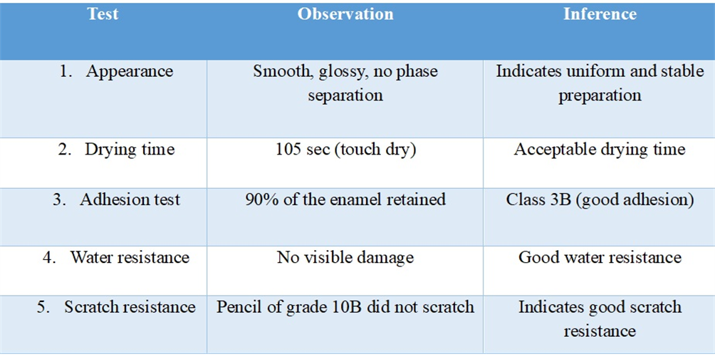 The prepared nail enamel formulation was subjected to various evaluation tests as mentioned above and the results obtained were as follows-