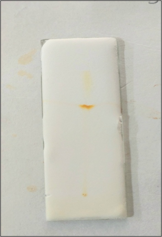 TLC of the extracted sample was performed using benzene: ethyl acetate: methanol as the solvent system. A distinct orange spot [figure 5] with rf value 0.52 was observed, which is in accordance with the literature data, suggesting the presence of bixin [11].