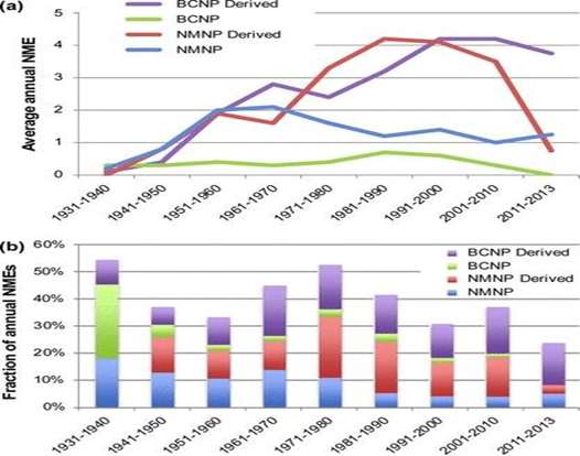 Figure 3.4.1. Natural product new molecular entity (NME) derivatives. (a) Average number of FDA- approved NMEs is shown on an annual basis. (b) Fraction of annually approved NMEs is separated into nonmammalian natural products (NMNPs) and biochemical natural products (BCNPs), as well as their semisynthetic or synthetic derivatives (adapted from Patridge et al. (1) with permission. Copyright 2016 Elsevier) [30]