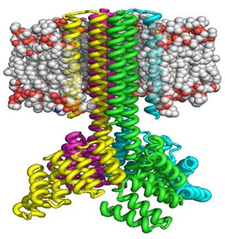 Molecular dynamics (MD) is an important computational tool for understanding the physical basis of the structure, the dynamic evolution of the system, and the function of biological macromolecules. Below, molecular dynamics simulations are performed on a lipid-protein complex. Shown are the backbone structure of the protein, a bound fatty acid molecule within the protein, and a small shell of water surrounding the protein. The time for the simulation was 100 picoseconds. The graphs give information about the motion of the lipid inside the protein.