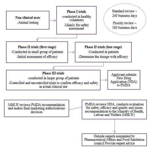 The regulatory agency in Japan is the Pharmaceuticals and Medical Devices Agency (PMDA). The PMDA was established by the Ministry of Health, Labour, and Welfare (MHLW) to evaluate applications for drug approval, Foreign Manufacturer Accreditation (FMA), Drug Master File (DMF) registration, and other related processes. Moreover, the PMDA offers guidance on the data required for clinical trials, approval submissions and other related processes. The paid in-person consultation services can help with the application process. Personalized protocol consultation, phase II research conclusion, before to NDA, and prior to INDA are the four phases of the consultation process. Japan's medication approval process utilizes the INDA and NDA protocols. The MHLW was initially established in 1938 with the goal of improving welfare, social security, and public health. In 2001, the Ministry of Health and Welfare, the Ministry of Labour, and the MHLW came together as part of the government programme. Similar its predecessor, the MHLW, which established many of the laws and regulations still in place today, the Japanese MHLW is a well-developed organization. The activities of the Pharmaceuticals and Medical Devices Evaluation Center of the National Institute of Health Sciences were merged to become the Pharmaceuticals and Medical Devices Agency in 2004. Working with the MHLW, the PMDA is responsible for reviewing drug and medical device submissions.