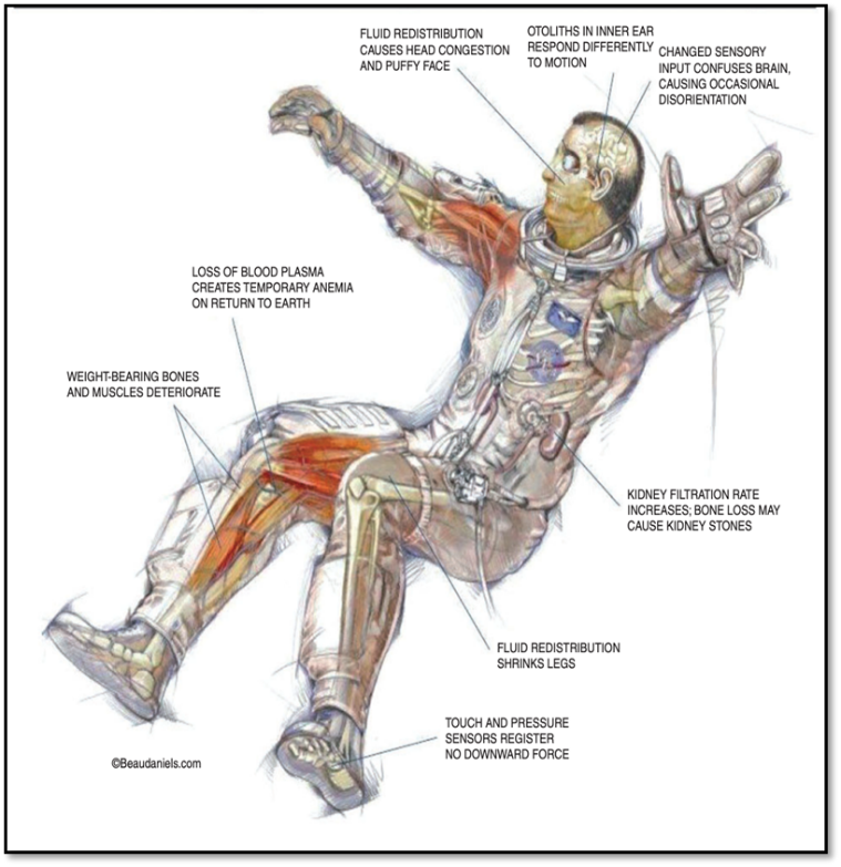 Space's microgravity environment can also interfere with a number of bodily processes. For instance, the deterioration of bones and muscles can result in osteoporosis and other issues; the kidneys' increased filtration rate can cause kidney stones; the body's fluid redistribution can cause puffy faces and "chicken legs"; and the cardiovascular systems can be severely stressed [7].
