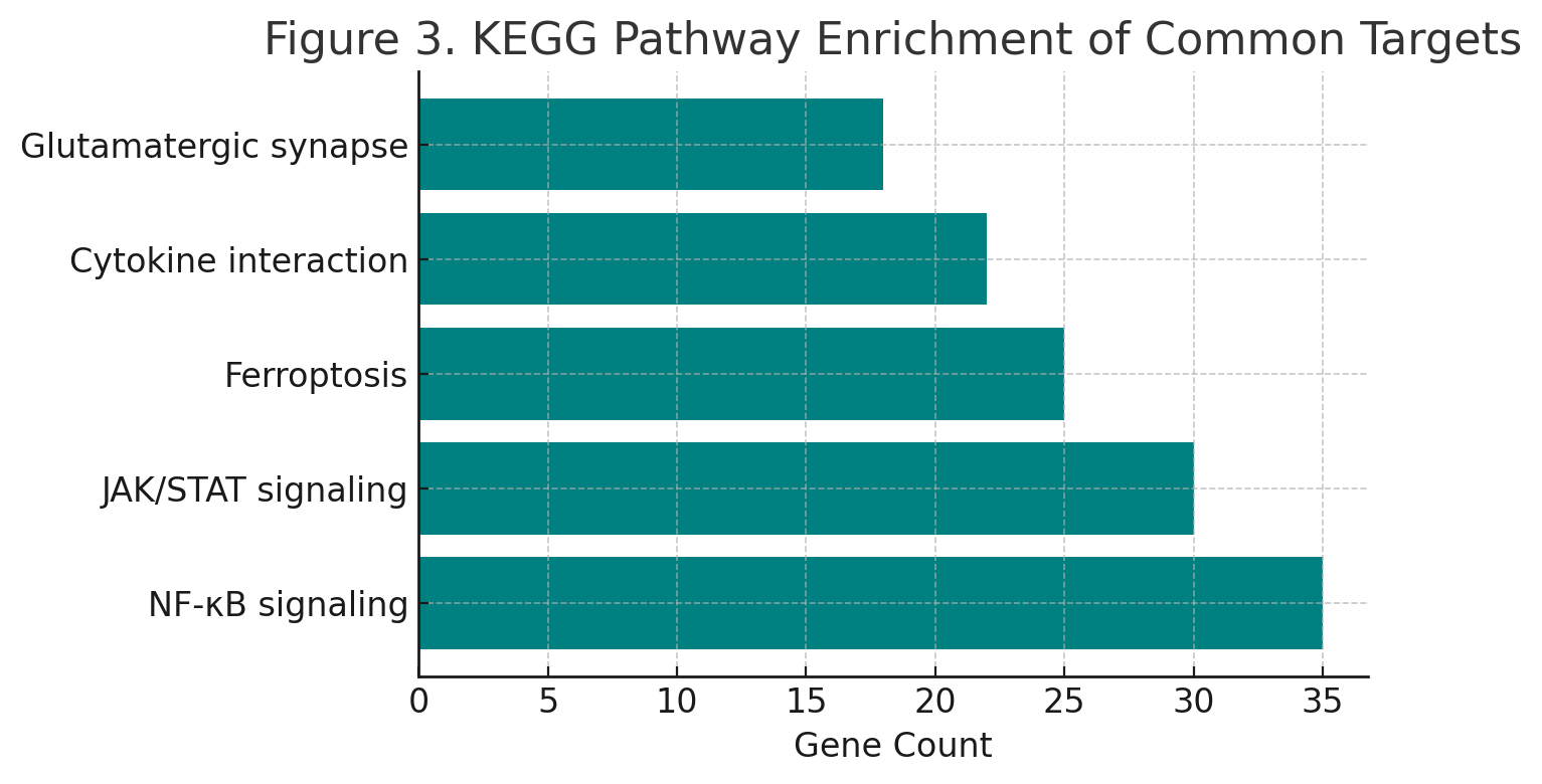 When we looked at the enriched Gene Ontology (GO) terms, we found some interesting themes. These included: a Response to oxidative stress, which highlights how cells react to damaging molecules; the Regulation of cytokine production, showing how our body manages immune responses; and the Inflammatory response, which is crucial for fighting off infections and healing. On the KEGG pathway side, we identified several significant pathways. Among them were the NF-κB signaling pathway, known for its role in controlling immune responses and cell survival; the JAK/STAT signaling pathway, which is key in transmitting signals from various cytokines; Ferroptosis, a form of regulated cell death that’s gaining lots of attention; and finally, Glutamatergic synapse regulation, which pertains to how neurons communicate and influence brain function. Each of these pathways paints a picture of the complex interactions happening at the cellular level. Statistical Criteria for Enrichment Gene Ontology (GO) and Kyoto Encyclopedia of Genes and Genomes (KEGG) pathway enrichment analyses were considered statistically significant at p < 0.05 with a false discovery rate (FDR) < 0.05. All analyses were performed using default background gene sets corresponding to Homo sapiens.