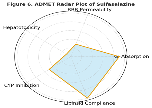 Pharmacokinetic and toxicity predictions were performed using three advanced computational tools: SwissADME, pkCSM, and ADMETlab 2.0. These platforms assessed a comprehensive range of pharmacokinetic properties, including gastrointestinal (GI) absorption, blood–brain barrier (BBB) permeability, cytochrome P450 (CYP450) isoenzyme inhibition profiles (such as CYP2C9, CYP3A4, and CYP1A2), and potential hepatotoxicity. [68,69,70,71]Additionally, predictions included drug-likeness evaluation (Lipinski’s Rule of Five), water solubility, total clearance, and potential for renal excretion. Toxicity endpoints evaluated encompassed hepatotoxicity, cardiotoxicity (hERG inhibition), and mutagenicity (AMES toxicity). Data outputs provided quantitative estimates and risk classifications, contributing to a holistic understanding of Sulfasalazine’s pharmacokinetic behaviour and safety profile in the context of drug repurposing for autoimmune and neuroinflammatory disorders.[72,73,74,75]