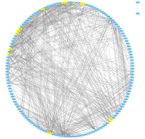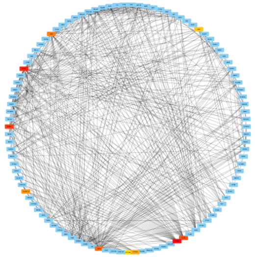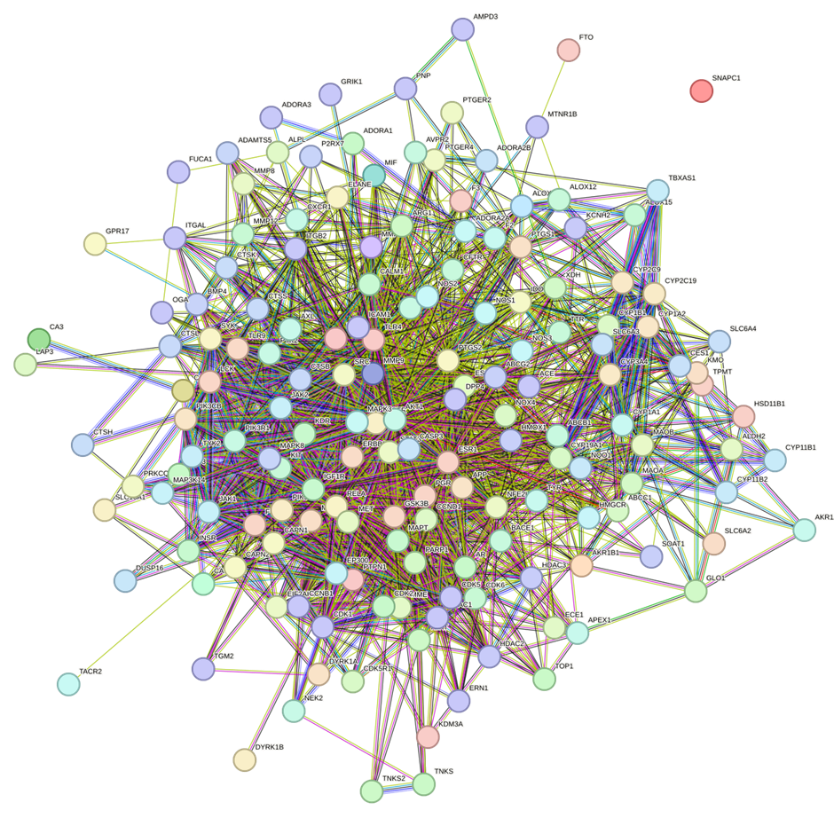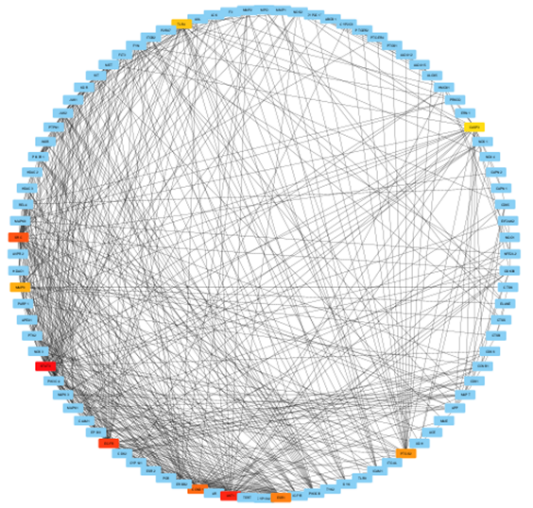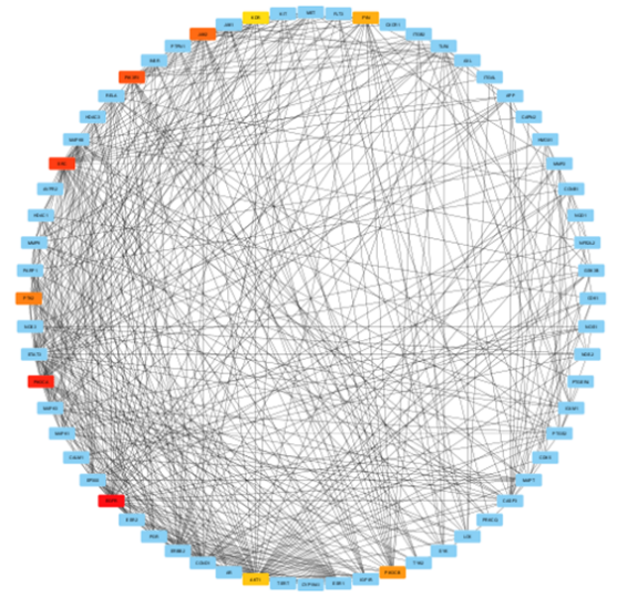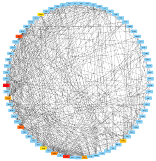 The visualize and analyze the interactions among these 163 genes, the STRING database (https://string-db.org/) was used to construct a PPI network with a minimum interaction confidence score of 0.7. The network was then exported and analyzed in Cytoscape v3.10.0, a widely used tool for biological network visualization. After importing the STRING-generated interaction file, the network was composed of 163 nodes (proteins) and multiple edges representing functional and physical interactions that is shown in fig no 3.