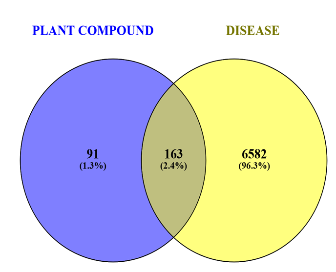 At the center of the diagram, the overlapping region (brown) shows 163 shared genes between the plant-derived targets and MI-related genes, making up 2.4% of the total analyzed gene pool in Fig no : 2. These shared genes are crucial because they represent direct molecular links through which Convolvulus pluricaulis may exert its therapeutic effects on myocardial infarction