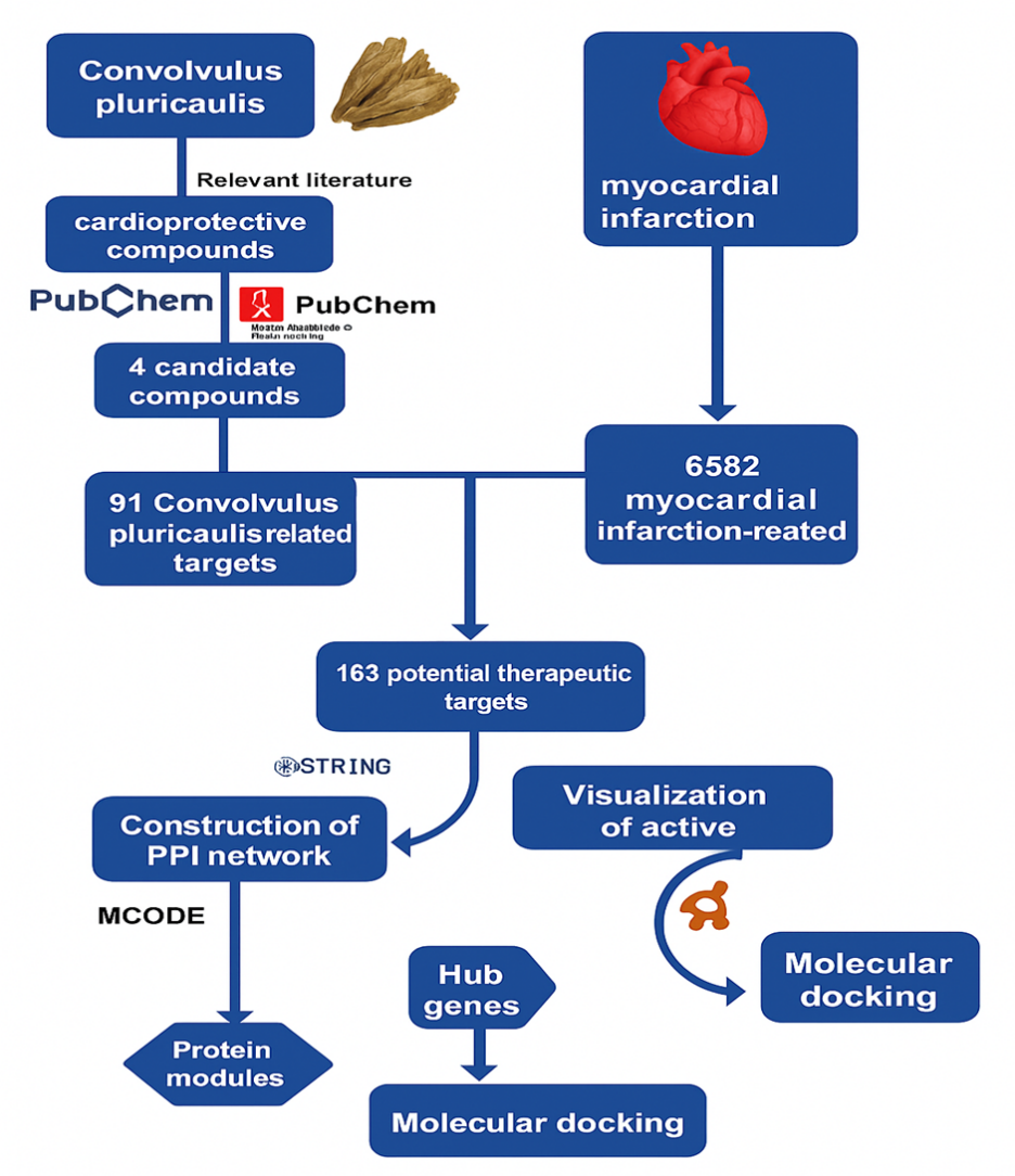 The integration of network pharmacology, target prediction, pathway enrichment, and molecular docking has revealed a compelling pharmacological rationale for the use of Convolvulus pluricaulis in myocardial infarction. The multi-target, multi-pathway modulation achieved by kaempferol and other phytochemicals aligns with the complex pathophysiology of MI, offering advantages over conventional mono-target drugs. Future steps should involve invitro validation, invivo animal modeling, and ultimately clinical trials to confirm efficacy, optimize formulation, and determine safe dosage ranges. Moreover, the same framework can be extended to investigate other traditionally used medicinal plants for cardiovascular disorders.