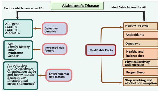 AD often leads to the loss of neurons and their connections in the entorhinal cortex, hippocampus, and cortex responsible for language, behavior, and thinking. Phosphorylated tau and amyloid beta accumulation in the brain impair synaptic function and cause neuronal cell death. Modifiable and non-modifiable risk factors that lead to AD are listed in Figure 7. [69]