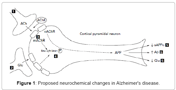 Cholinergic neurotransmitters in the central nervous system are connected to glutamatergic and neurons, which are critical for cognition.Alzheimer's disease pathogenesis includes alterations in glutamate receptor levels, particularly the NMDA receptor. Alzheimer's disease is characterized by persistently low levels of NMDA receptor stimulation, which results in reduced neurotransmission. [21] Abnormal NMDA receptor modulation results in prolonged calcium influx, which causes neuronal damage and signal disruption. Increased APP synthesis increases plaque formation and tau hyperphosphorylation, which results in neurofibrillary tangles and toxicity. Glutamate is removed by reuptake, and tau hyperphosphorylation is thought to occur after plaque development, however the exact source is unknown. [21]