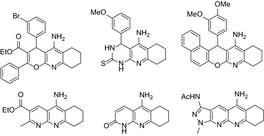 Tacrine, a small molecule medication, is the first licensed cholinesterase inhibitor (ChEI) for treating Alzheimer's disease. Other approved ChEIs include donepezil, rivastigmine, and galantamine. Tacrine has been linked to certain adverse effects. In recent years, researchers have attempted to improve the efficacy of tacrine by synthesizing hybrid molecules referred to as ChEIs. As per figure 9[79]