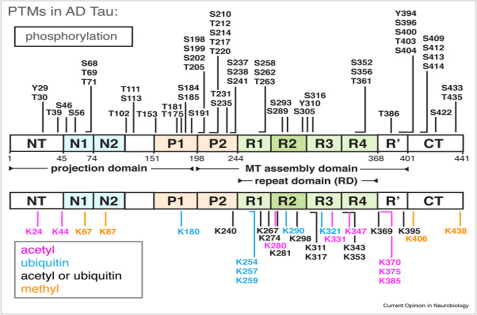 Tau, a microtubule-associated protein, helps axons, but aggregation causes neuronal injury and degeneration. Targeting tau, which is intimately connected to AD development, has been a primary focus for treatment after Aβ treatments failed. [22] Hyperphosphorylation and aggregation of tau, regardless of mutations, lead to active disease during aging. Inhibiting this mechanism could potentially prevent, hold up, or even reverse Alzheimer's disease. [23] Phosphorylation, a amino acid called monomethylation, lysine in acetylation, lysine in monomethylation, lysine in dimethylation, lysine in ubiquitylation, and serine are among the modifications that tau experiences. [22]