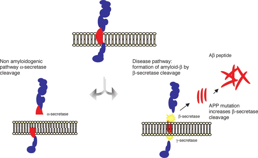 Secretases break the APP, or amyloid precursor protein by two pathways: nonamyloidogenic (α-secretase inhibits deleterious peptide synthesis) and amyloidogenic Neurotoxic Aβ peptides are produced by β- and γ-secretases. Asymmetry in Aβ synthesis and clearing leads to hazardous oligomers and plaques. Aβ toxicity and aggregation are influenced by factors such as its sequence, concentration, and stability. [13]