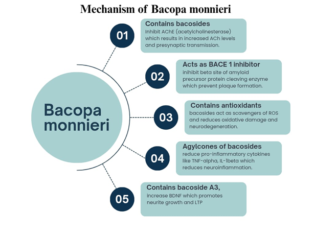 Thus, with a more comprehensive analysis in vivo and in vitro, Bacopa monnieri can be a promising drug to improve cognitive function, memory, and Alzheimer's, as well as many other neurodegenerative diseases, particularly in women at low doses and with fewer side effects.