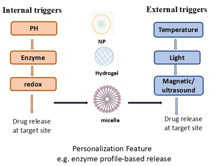 Stimuli-responsive drug delivery systems (DDS) have emerged as an advanced class of nanomedicine engineered to release therapeutic cargo in response to endogenous or external stimuli as shown in figure 2. These platforms overcome the limitations of conventional formulations by enabling spatiotemporal control, improved bioavailability, and reduced systemic toxicity [1]. Internal triggers such as acidic pH, redox gradients, hypoxia, and disease-associated enzymes are frequently exploited in tumor and inflammatory microenvironments. For example, pH-sensitive micelles and hydrogels undergo structural disassembly in acidic sites, facilitating selective drug release [2]. Enzyme-activated carriers employ proteases or glycosidases as switches for targeted therapy, particularly in cancer and inflammatory disorders [3]. Redox-responsive nanocarriers utilize intracellular glutathione gradients to achieve selective activation in tumor and inflamed tissues [4]. External stimuli—including ultrasound, temperature, magnetic fields, and light—have also been integrated into carrier designs, offering non-invasive on-demand activation [5]. Recent innovations emphasize dual- or multi-stimuli-responsive platforms, where combined triggers enhance selectivity, minimize off-target effects, and enable multifunctional roles such as drug delivery coupled with imaging or theranostics [6,7]. These approaches are now central to the development of precision therapeutics for oncology, inflammation, and chronic diseases.
