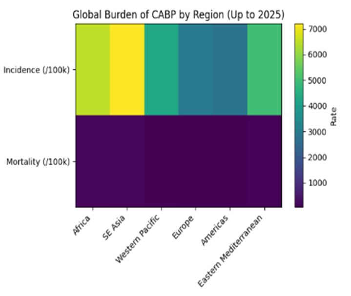 Figure 7: Marked regional differences in the incidence and mortality of CABP are observed worldwide, with the highest burden reported in South-East Asia and Africa.