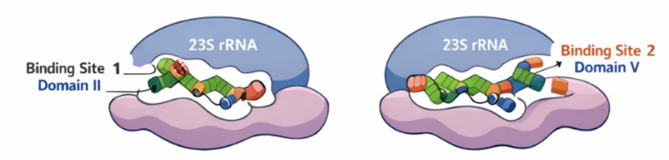 Nafithromycin contains a rigid aromatic side chain attached to the macrolactone ring, which is absent in azithromycin and clarithromycin. This side chain extends into domain II of the 23S rRNA, enabling a second anchoring point within the ribosomal exit tunnel. As a result, nafithromycin exhibits dual ribosomal binding, significantly increasing binding affinity and reducing the likelihood of resistance due to target site modification [30].