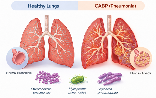 Figure 1: Comparison of Healthy Lungs and Community-Acquired Bacterial Pneumonia (CABP) with Common Causative Pathogens.