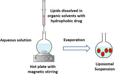 In a round-bottom flask, lipids and hydrophobic medications are first dissolved in an appropriate organic solvent. After that, a thin lipid coating is formed on the flask's inner wall by carefully evaporating the organic solvent under low pressure. The thin film is then hydrated with an aqueous buffer solution at a temperature greater than the phase transition temperature (Tm) of the lipids. The hydration medium may contain hydrophilic medications intended to be contained in the watery core of the liposomes.
