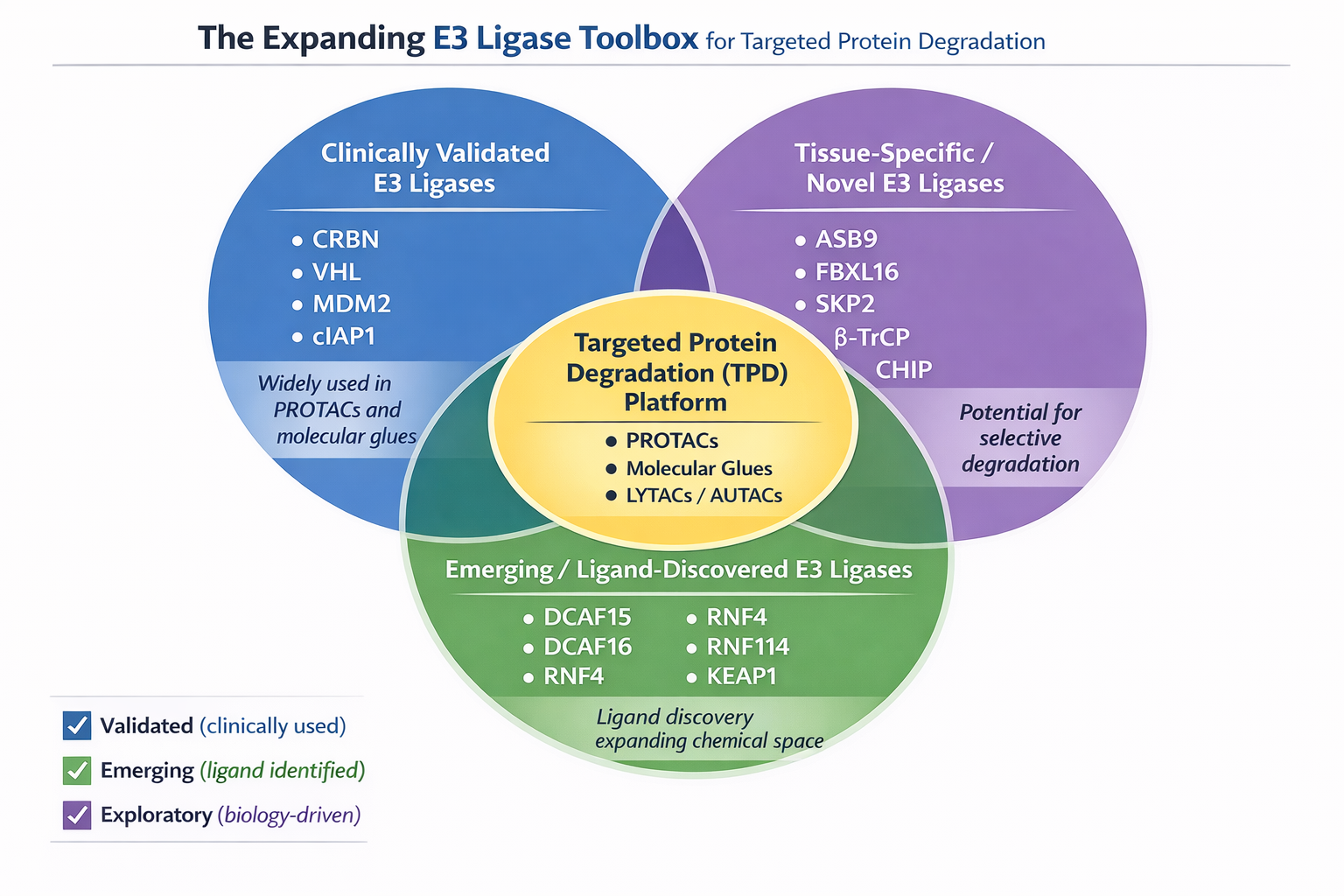 Early PROTACs relied heavily on the E3 ligases Cereblon (CRBN) and Von Hippel-Lindau (VHL). While successful, this reliance presents limitations. First, CRBN and VHL are ubiquitously expressed, potentially causing systemic degradation and toxicity. Second, some cancers downregulate these ligases to develop resistance. Next-generation strategies are addressing these bottlenecks.
