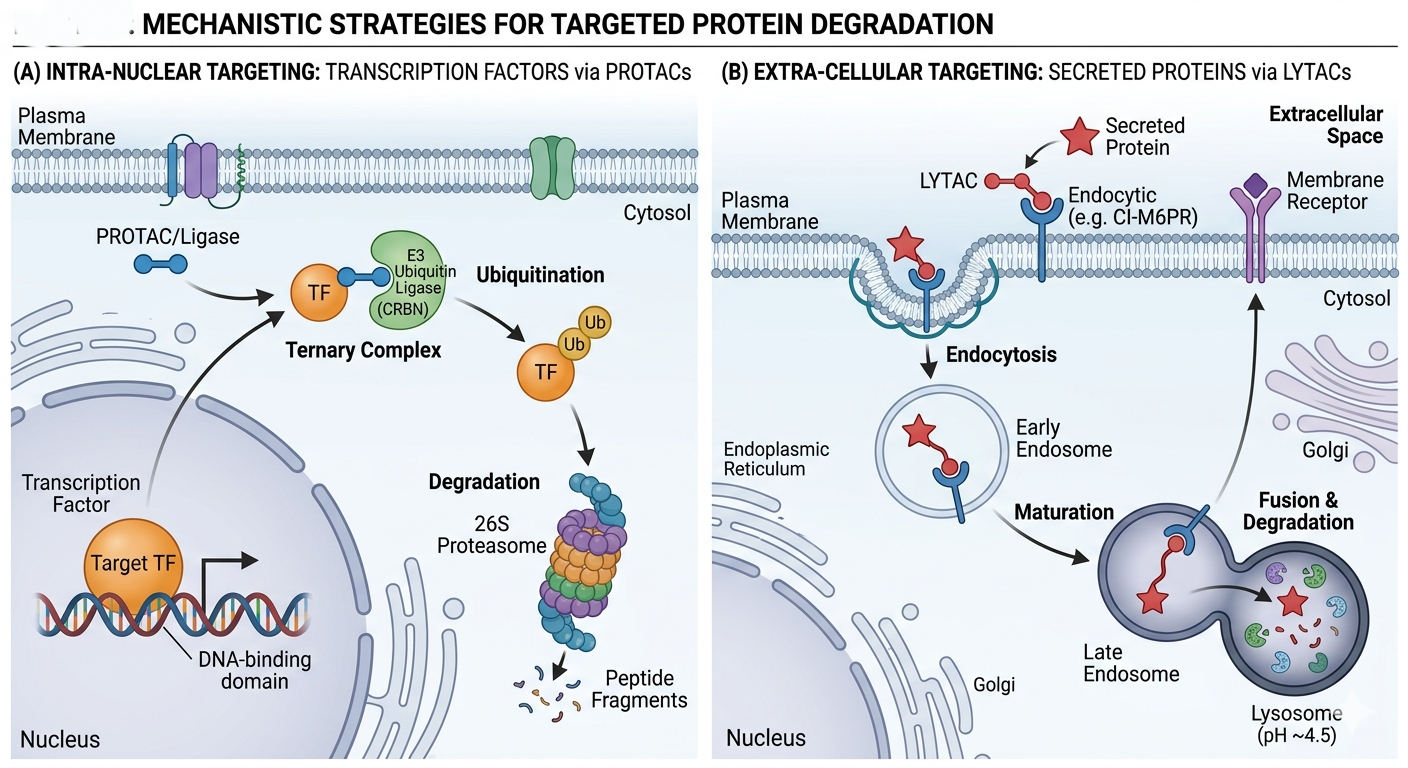 LYTACs (Lysosome-Targeting Chimeras): These bifunctional molecules bind extracellular proteins (e.g., immune checkpoints like PD-L1) and engage the lysosomal targeting receptor (CI-M6PR), routing the protein to the lysosome for degradation. This expands the TPD modality to secreted factors and membrane receptors [11].