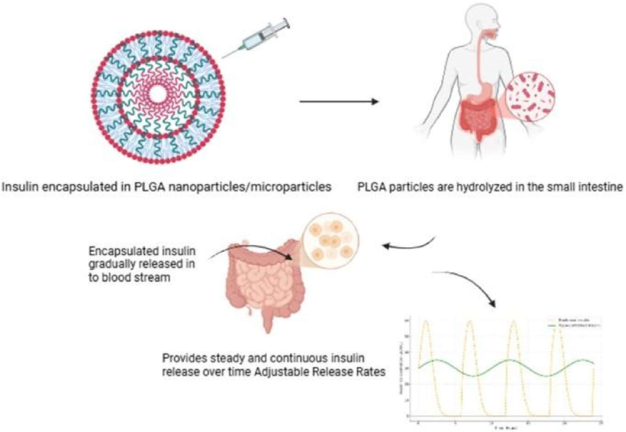 Insulin molecules are encapsulated within nanoparticles made from materials such as polymers (e.g., PLGA, chitosan) & lipids. This protects insulin from enzymatic degradation in the gastrointestinal tract when administered orally or through other non-invasive routes.